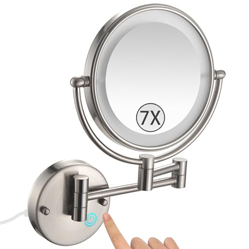 Zysfadc Miroir De Maquillage Éclairé À Fixation Murale, Miroir Grossissant LED Double Face De 8", Miroir Cosmétique Extensible À Interrupteur À Poussoir,Brushed Nickel,7X