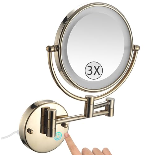 Zysfadc Miroir De Maquillage Éclairé À Fixation Murale, Miroir Grossissant LED Double Face De 8", Miroir Cosmétique Extensible À Intensité Lumineuse Réglable par Simple Pression,Brushed Gold,3X