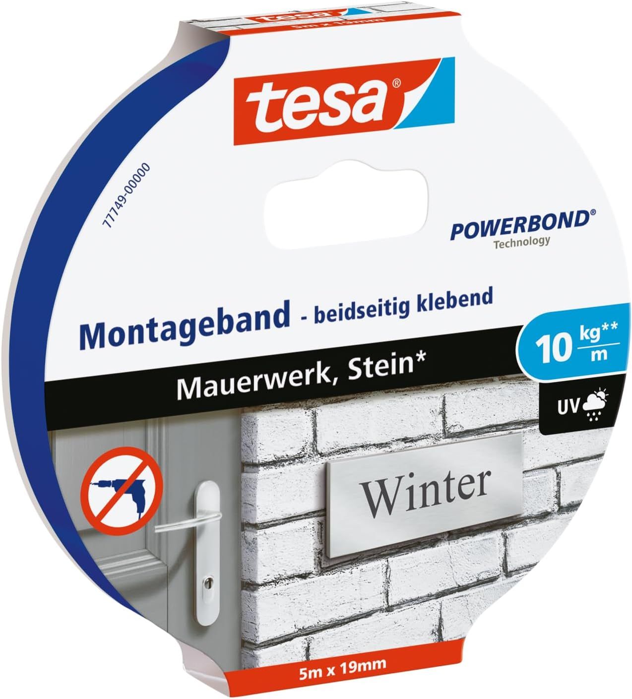 tesa Powerbond Adhésif Double Face de Fixation Pour Brique et Pierre 10 kg/Mètre* – Ruban Adhésif de Fixation Murale pour Intérieur et Extérieur – 5 m x 19 mm