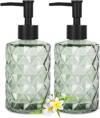 2 Distributeur Savon Liquide, 300 ML Distributeur de Savon Liquide en Verre pour Cuisine et Salle de Bain, Rechargeable Flacon Pompe Vide, Distributeur Shampoing et Gel Douche, Bouteille de Lotion