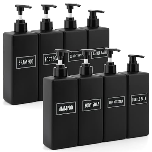 Segbeauty 8 Pièces Set Distributeur Shampoing, 500ml Flacon Pompe Vide Groupe avec Étiquette, Ensemble de Salle de Bain en Plastique, pour Hôtel, Résidence, Conditionneur et Lotion - Noir