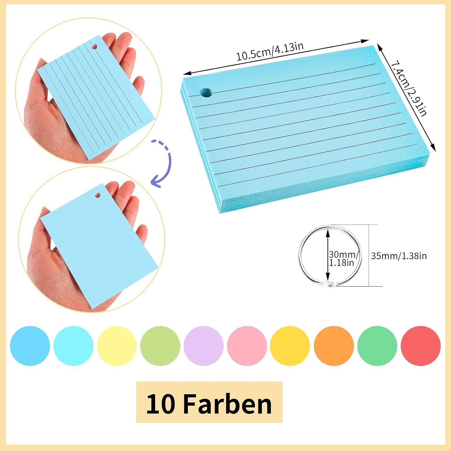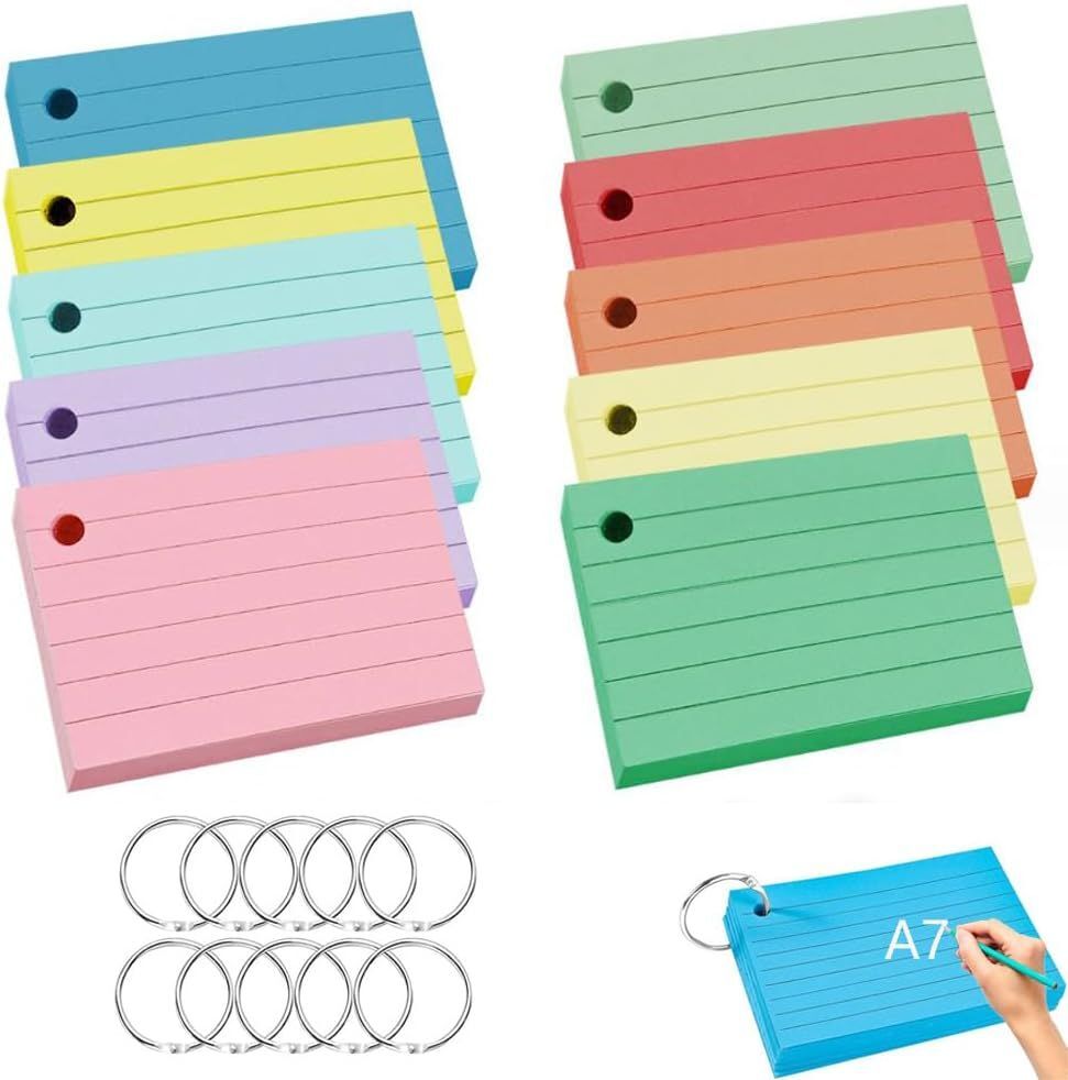ASFASFq-Lot de 500 Flash Cards A7, 10,5 x 7,4 cm 10 Couleurs Fiche Revision Cartes Index Lignées Papier 150g/m² Fiches Perforées avec 10 Anneaux de Reliure pour École Bureau Maison Étude Notes