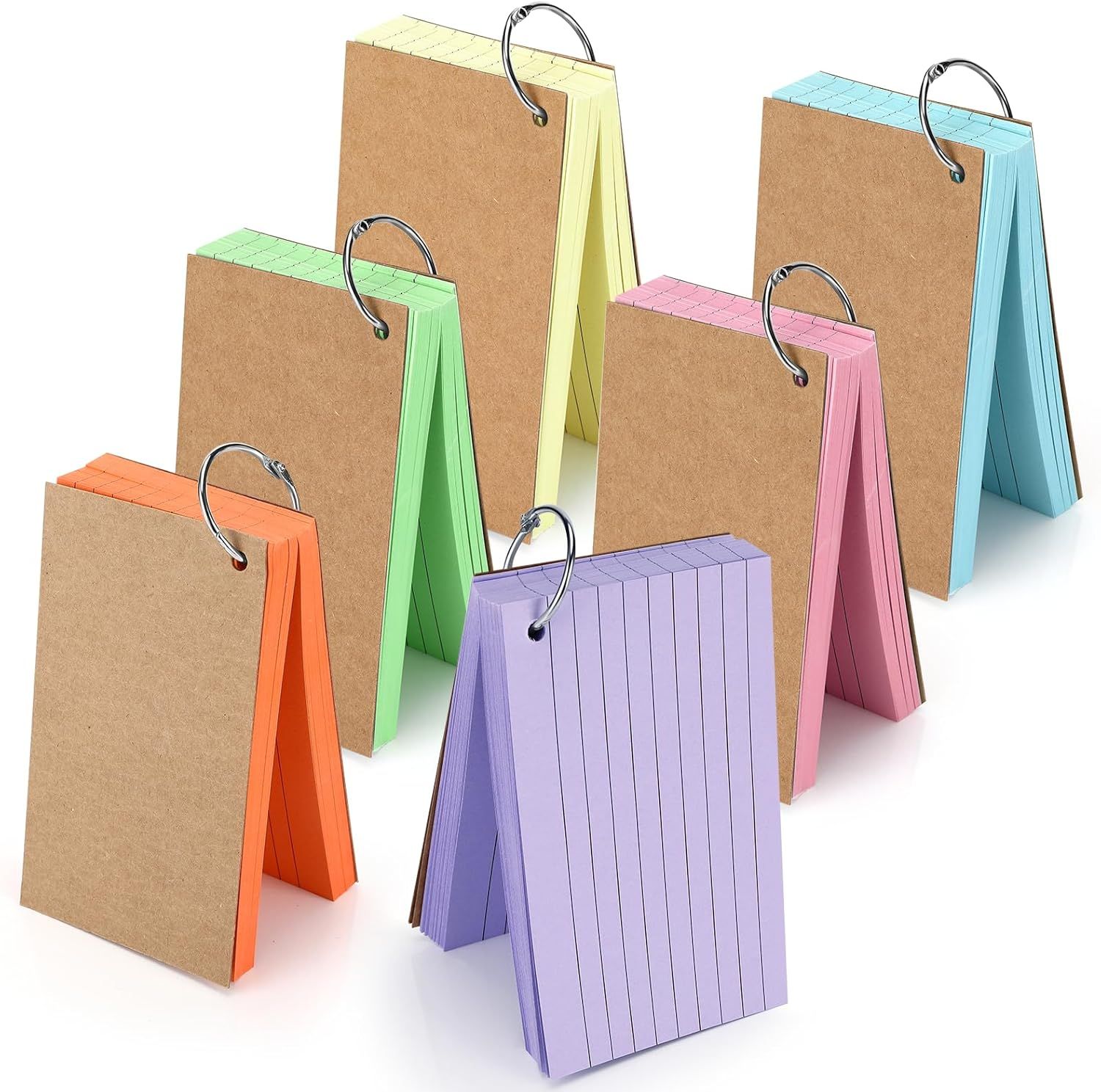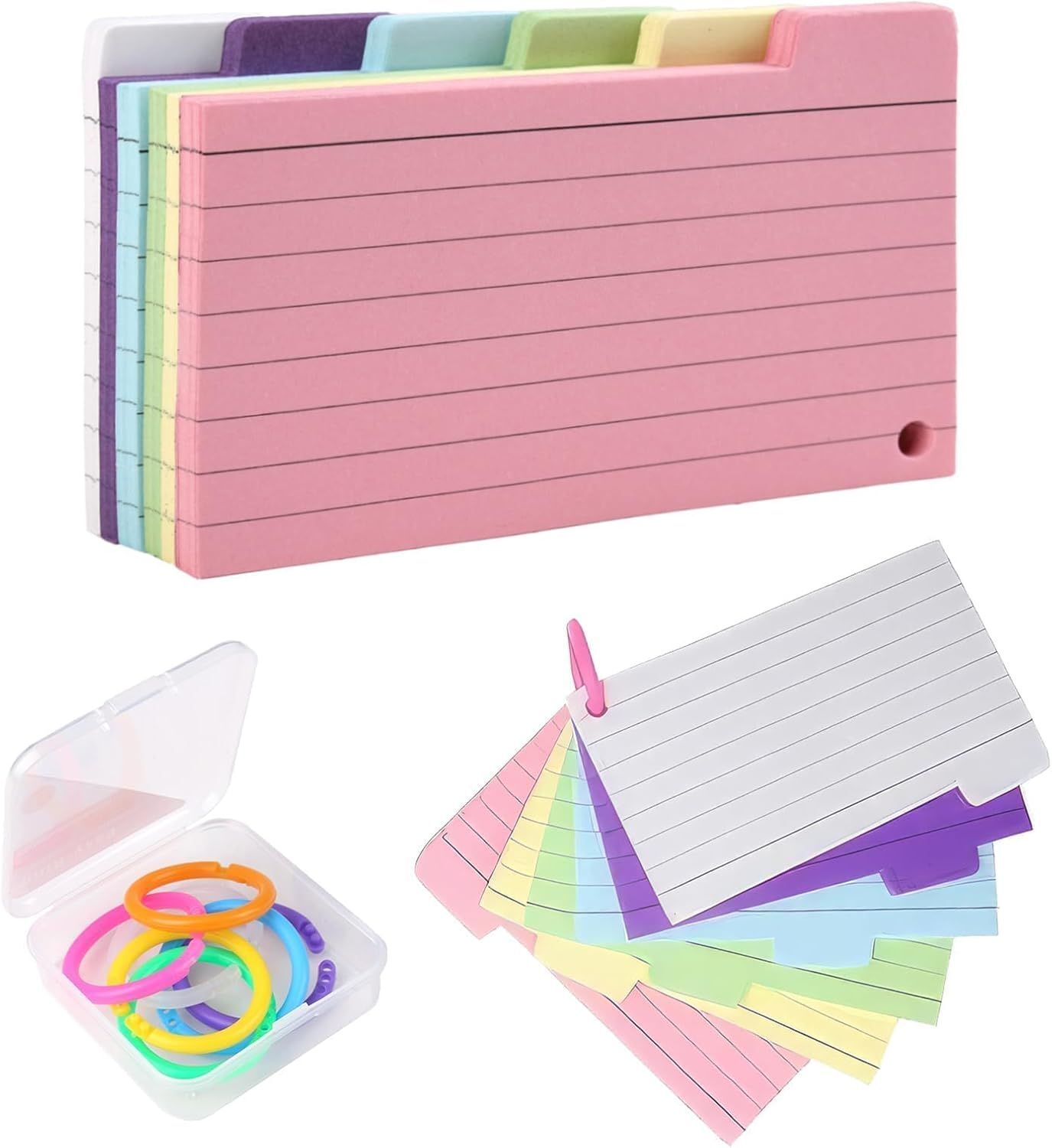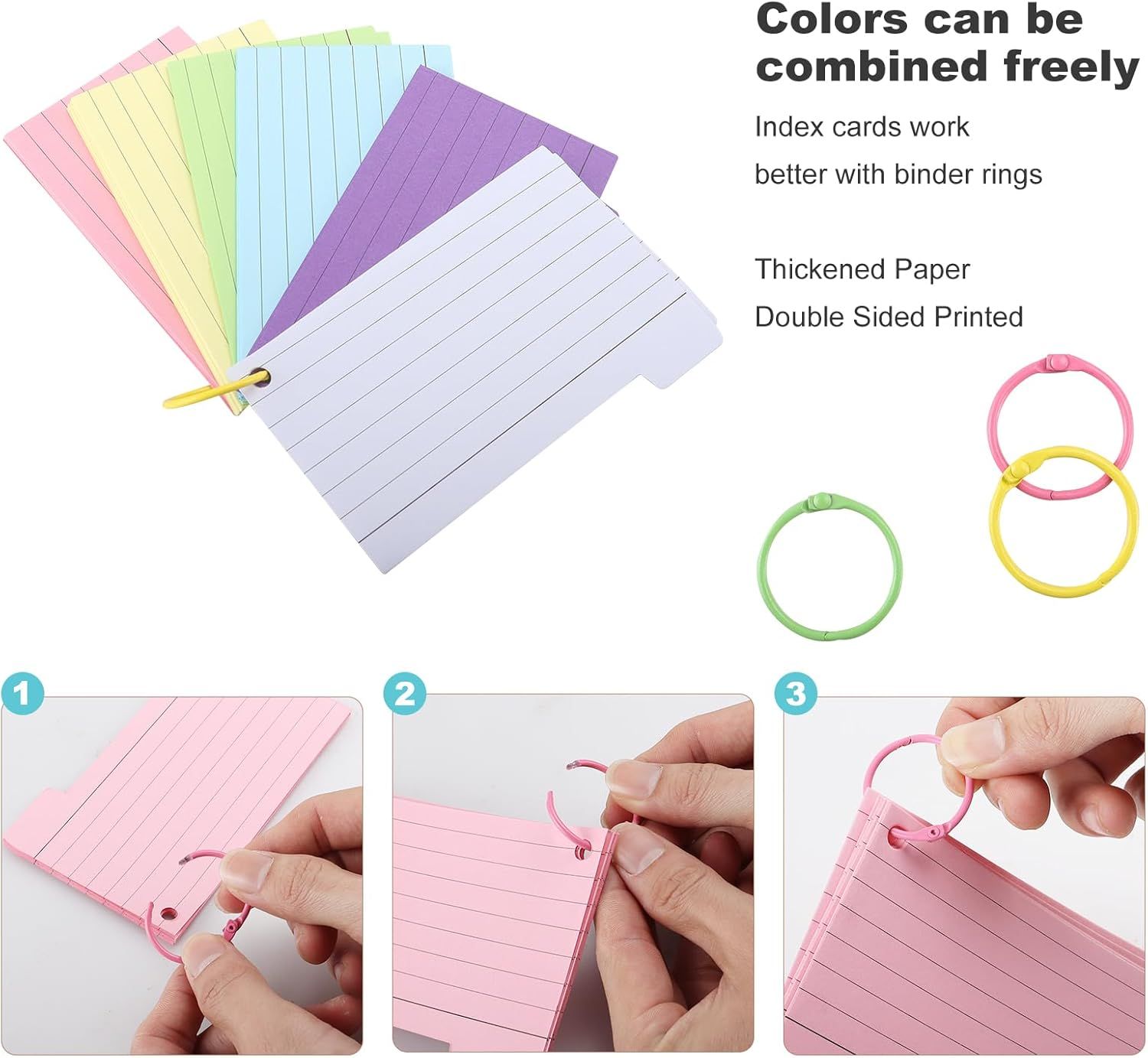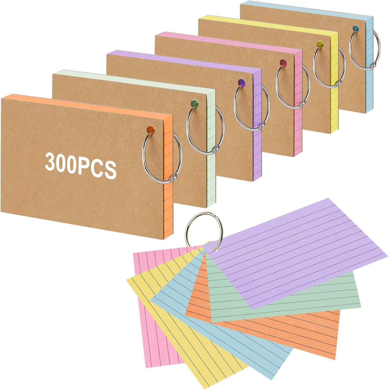 ASFASFq-300pcs Flash Cards, Fiches Bristol 12,5 x 8cm, 6 Couleurs Cartes de Révision avec Anneaux, cartes lignées, cartes de vocabulaire Flash,Cartes de Vocabulaire pour École Bureau Maison Étude Not