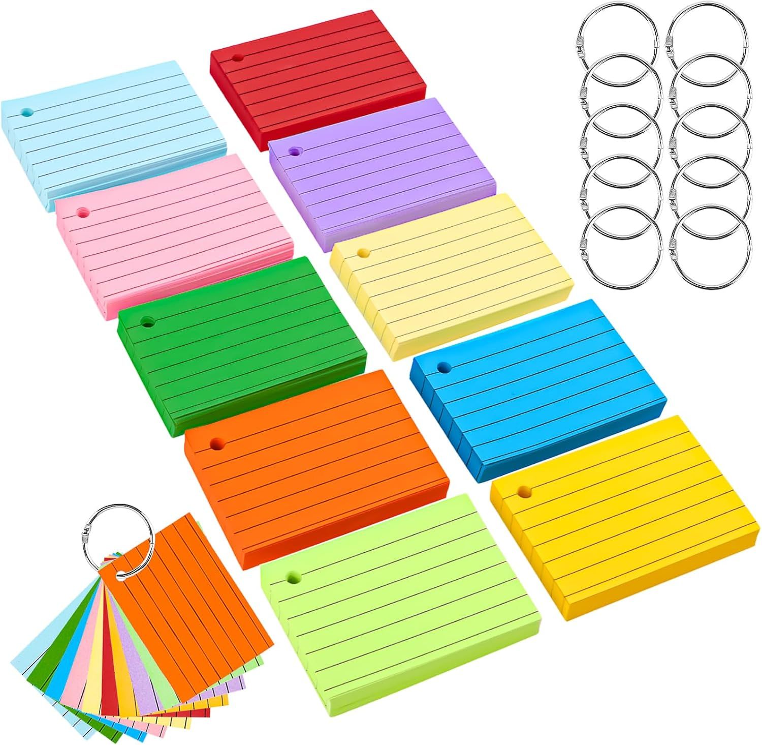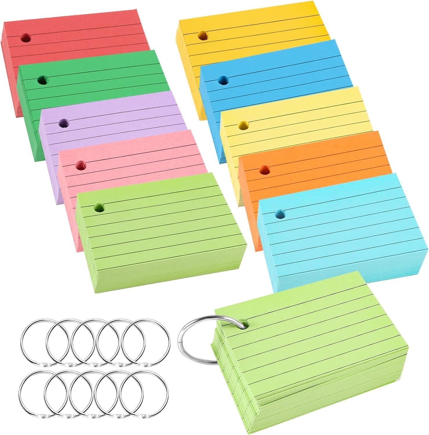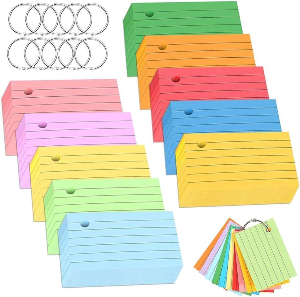 ASFASFq-500 Flash Cards A8, Multicolore Flashcards Fiches de Suivi,7,4 x 5,1 cm Fiche de Revision Cartes Index Lignées Papier avec 10 Anneaux de Reliure pour École Bureau Maison Étude Notes (10 Coule