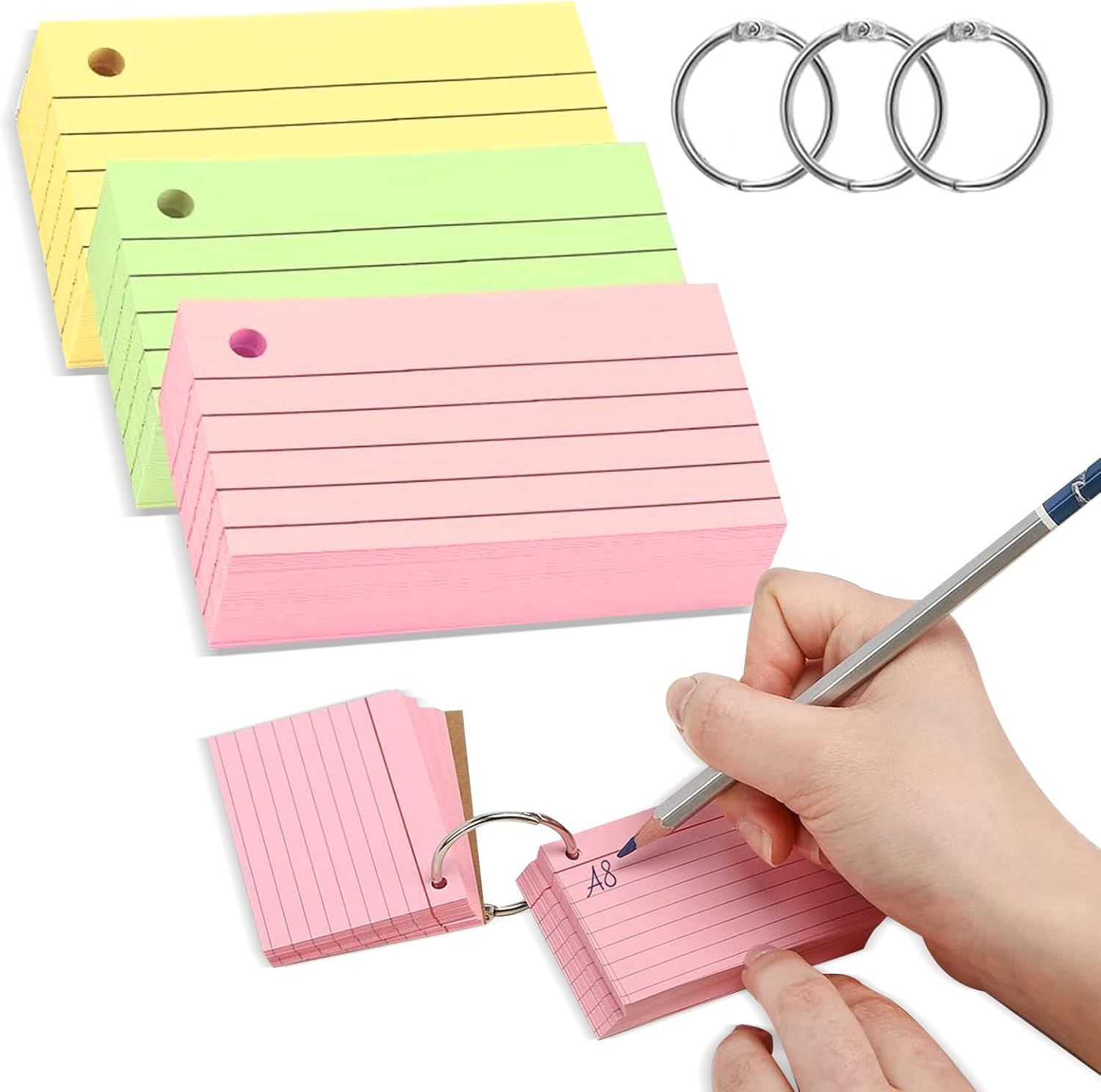 ASFASFq-Flash Cards, 300pcs Fiches Bristol, 12,7x7,6cm Cartes de Révision avec 6 Anneaux de Reliure, Cartes d'index, Carte de Vocabulaire, Carte Index Lignées pour École Bureau Maison