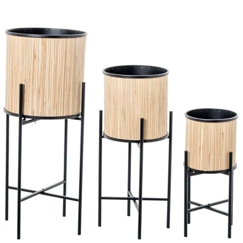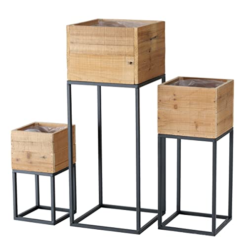 DRW Lot de 3 pots de fleurs en métal et bois naturel et noir 30 x 30 x 75 cm