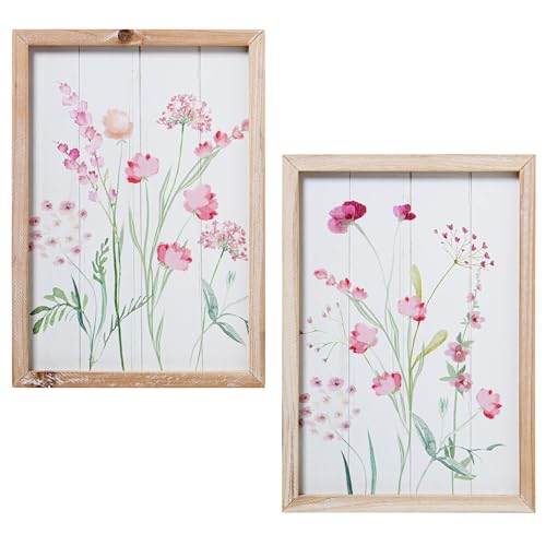 Lot de 2 tableaux sur toile avec fleurs et cadre en bois naturel en rose, vert et bleu 80 x 120 x 3,5 cm