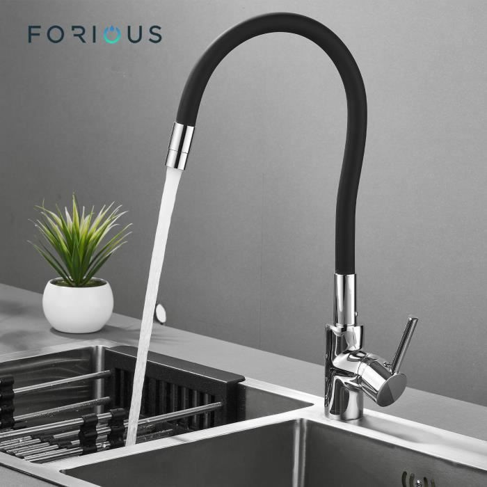 FORIOUS Robinet Cuisine Flexible Bec Mitigeur Évier Laiton Rotative à 360° Chrome Noir Robinet Evier à Eau Chaude et Froide