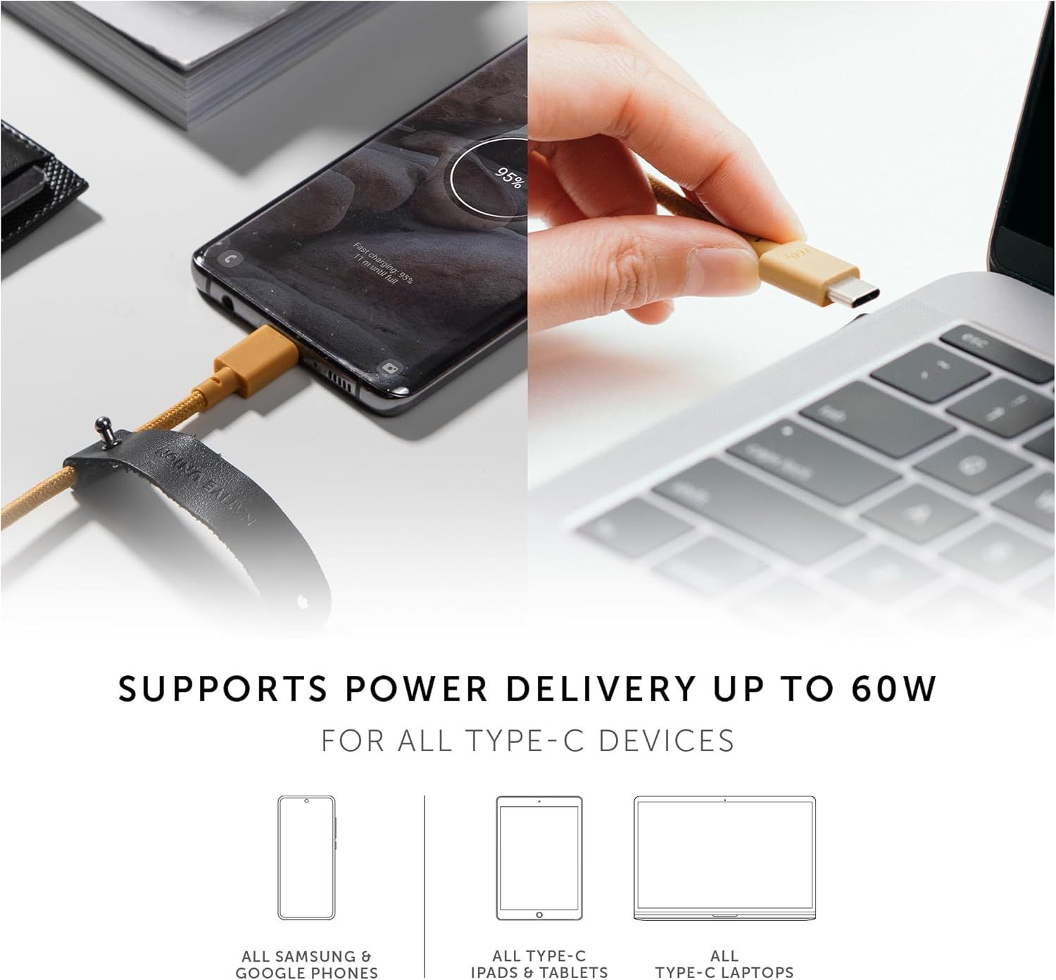 Type-C Belt Cable-Câble USB-C vers USB-C 1,2m ultra-résistant Compatible avec iPhone 16,16 Plus,16 Pro,16 Pro Max,iPad Pro,iPad Air,Galaxy S24,Flip 6,Fold 6 (Kraft)