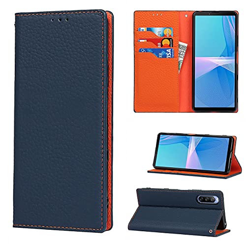 Copmob Coque Sony Xperia 10 III,Cuir véritable Flip Portefeuille Étui en Cuir,[3 Fentes][Fermeture magnétique][RFID Blocker],Clapet Housse Etui Rabat pour Sony Xperia 10 III - Bleu foncé