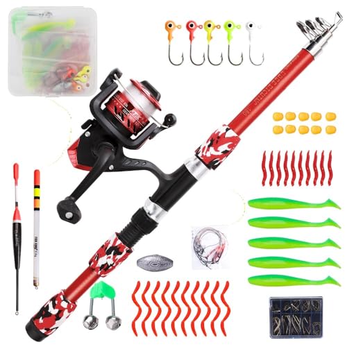 Ensemble De Cannes À Pêche, Kits Complets avec Canne À Pêche Télescopique De 1.8M, Moulinets Spinning, Flotteur, Leurres De Pêche en Mer, Crochet(Red-003)