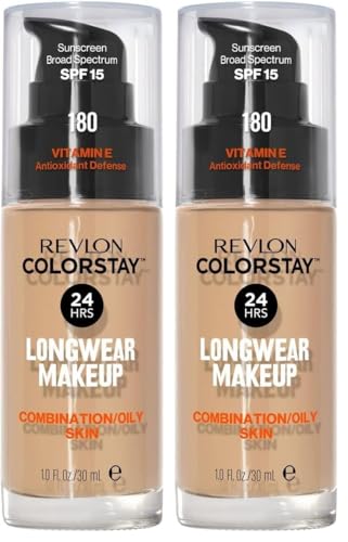 Fond de teint Revlon, ColorStay Longue Tenue, peaux mixtes à grasses, 24H tenue + soin, formule enrichie en vitamine E, nourrissante et protectrice, SPF 15 N°180 Sand Beige (30ml) (Lot de 2)