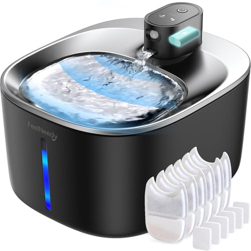Fontaine a Eau Chat sans Fil à Pile [Séparation de l'eau et de la Batterie] FEELNEEDY Fontaine en Acier avec Détecteur avec Batterie Rechargeable 4000mAh-3,5L, avec 6 Set Filters