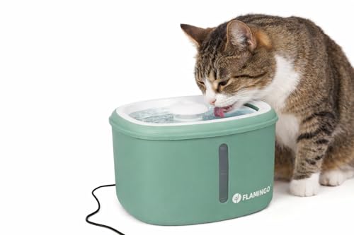 Fontaine a Eau Chat - Flamingo Finto Vert - 2,5L - Plastique - Pompe Super silencieuse arrêt Auto - Filtre Charbon Actif et résine - indicateur Lumineux