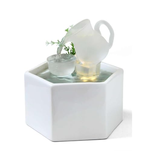 Fontaine à Cascade créative pour Bureau intérieur, décoration de Fontaine de Table. Fontaine intérieure en céramique Blanche avec Eau en Circulation et éclairage LED Blanc Chaud.