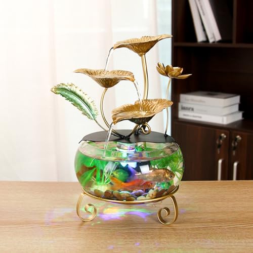 MIXIUJIEN Fontaine à eau en forme de fleur de lotus dorée avec lumières LED et aquarium, décoration de table élégante pour la maison et le bureau, cascade intérieure relaxante pour ambiance de bureau