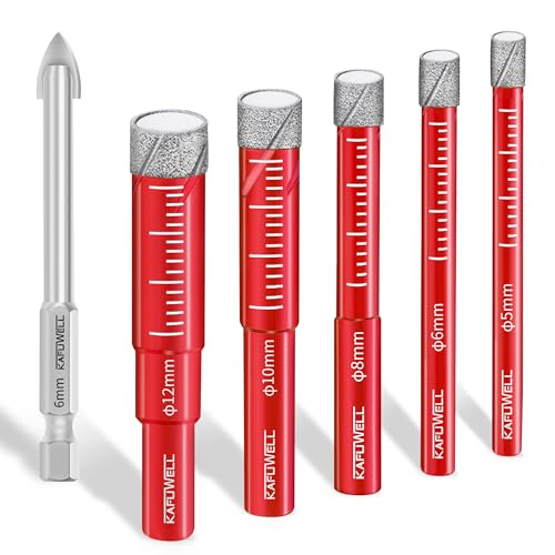 KAFUWELL 6 Pièces Foret Diamant Carrelage, Foret Diamant Cerame avec 5,6,8,10,12 mm, Foret en Carbure de 6 mm, pour Carrelage Céramique Quartz Verre Granit Brique Marbre Porcelaine