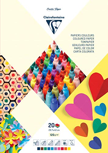 Clairefontaine 97148C - Bloc de 20 Feuilles de Papier Couleur - Format A3 (29,7x42cm) - Papier 120g/m² pour Bricolage et Dessins - Loisirs Créatifs Enfants et Adultes - 10 Couleurs Assorties x2 Fles