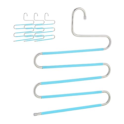 Relaxdays Cintre pour Pantalon, Lot de 4, Forme Un S, 5 Barres, antidérapant, Peu encombrant, argenté et Bleu Clair