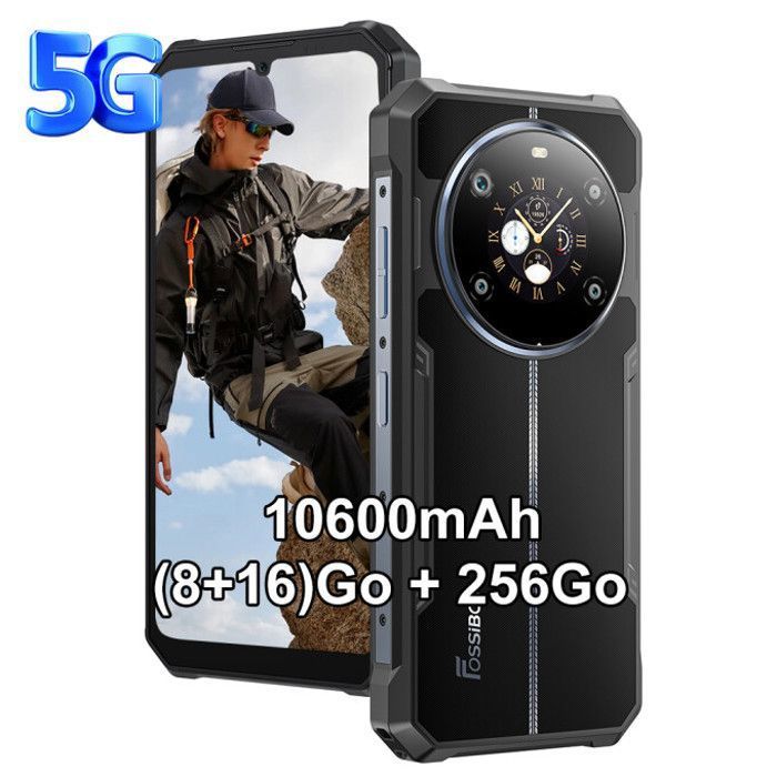 FOSSiBOT F109 5G Téléphones Portables Débloqués, 10600mAh / 18W, 24GB + 256GB, Octa Core, 50MP Caméra + 16MP, Android 14, 6.75" Smartphones, W/ 1.32" Back Touch Watch, IP68/IP69K/NFC Noir