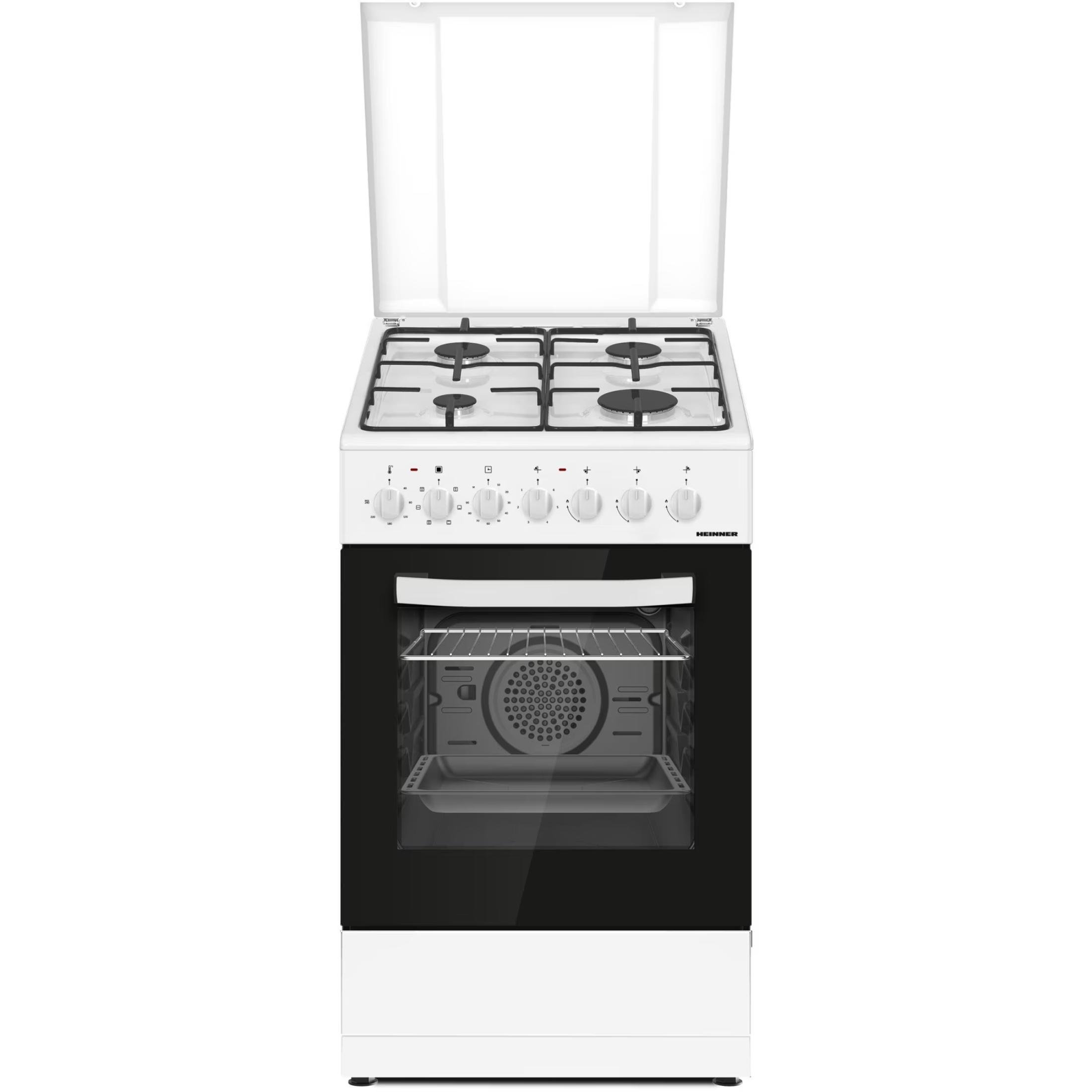 Cuisinière à gaz Heinner HFSC‑S60LITGC‑WH, 4 brûleurs à gaz, four électrique, grill et chaleur tournante, blanc