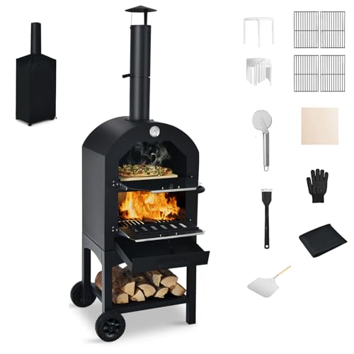 KOMFOTTEU Four à Pizza pour l'Extérieur, 2 Niveaux, 200℃-350℃, Four en Bois portable en Fer, Mini-four avec Pierre à Pizza, Spatule à Pizza, Grille, Couvercle étanche, pour Fêtes, Barbecues