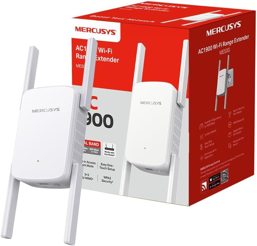 ME50G WiFi Repeater, AC1900Mbps Dual-Band WiFi Amplifier, WiFi Extender, Four Adjustable High Gain Antennas, 1 Gigabit Port, MU-MIMO, Compatible with All Internet Boxes