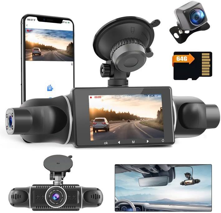 3.0" DVR 1080P WiFi Dashcam Four Dashcam Voiture APP Control avec Carte TF 64G Grand Angle de 360°G-Capteur 24H Mode Parking Enregistrement en Boucle Caméra de Voiture avec Vision Nocturne
