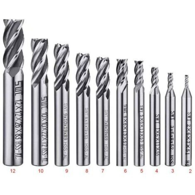 Lot de 10 forets à 4 cannelures - de 2 à 12 mm Fraise en Bout- Ensemble de forets à tige droite hss cnc pour perceuse - Ensemble d'outils pour bois,