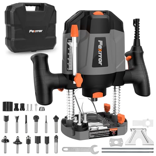 Affleureuse Défonceuse a Bois 1200W, Fexrror Affleureuse avec 30000 RPM, 7 Vitesses, Set de 12 Fraises, Port de Poussière, Support de Eail Parallèle, Réglage de la Profondeur de Fraisage