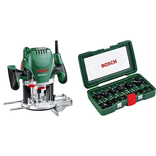 Défonceuse Bosch - POF 1200 AE (Livré avec: Adaptateur d’aspiration, Fraise à rainurer droit Ø 8 mm, Butée parallèle, 3 pinces de serrage). & Coffret Bosch de 15 fraises au carbure (Queue Ø 8 mm)