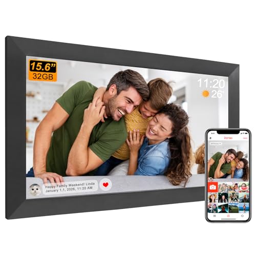 FRAMEO Cadre photo numérique 15,6 pouces extra large WiFi 32 Go IPS HD Écran tactile Partage de photos et de vidéos via l'application Frameo avec musique et météo