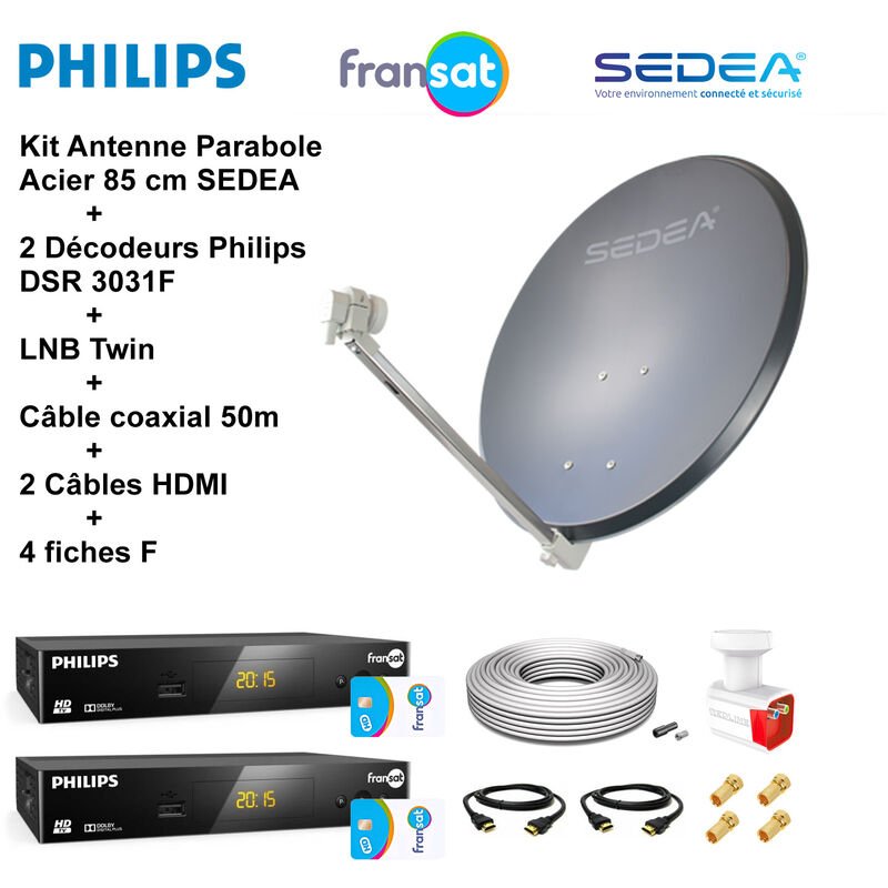 M-e - Kit Parabole Acier 85 cm Anthracite + lnb Twin hd 4K + 2 Décodeurs srt 7407 fransat + Câble coax 50m + 2 Câbles hdmi + 4 Fiches f - Acier