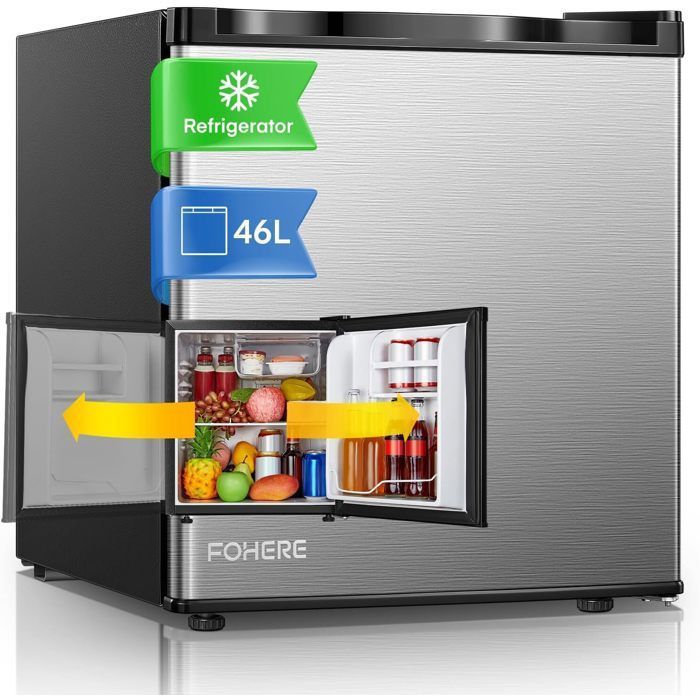 FOHERE Mini Réfrigérateur 46L, Petit Frigo avec Thermostat Réglable, Économie d'Énergie, Silencieux, Porte Réversible, Minibar, Adapté à la Maison et au Bureau, Dortoir, Hôtel, Inox