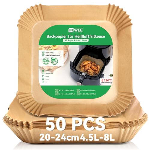 Inwee Papier Cuisson Air Fryer, 50 Pièces 20-24 cm Papier Sulfurisé pour Air Fryer, Food-Grade BPA Gratuit, Antiadhésive Disposable Paper Liner, pour Friteuse sans Huile 5 à 8 litres