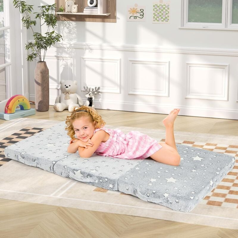 Matelas de Sol Pliable pour Enfant, Matelas en Flanelle Doux, Tapis de Jeu Lumineux pour Dormir, avec Poignées et Sac de Transport, Futon pour