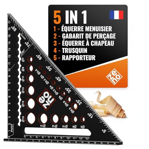 ZENO Equerre Menuisier 180 mm - Equerre Charpentier - Outil Menuisier Tout-en-un : Équerre, Rapporteur, Règle, Trusquin, Gabarit de percage - Crayon de Chantier Professionnel