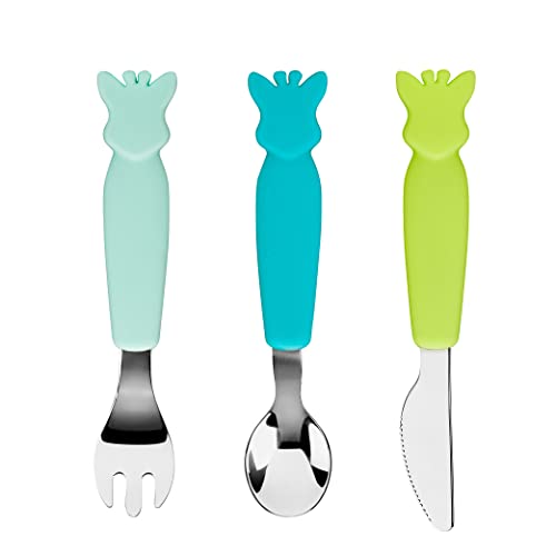 Sophie la Girafe - Set de 3 Couverts - Fourchette, Couteau Fourchette et Cuillère - Silicone - Forme de Girafe sur les Manches - Apprendre à manger comme un grand