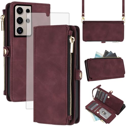 Asuwish Coque pour Samsung Galaxy S24 Ultra 5G Portefeuille avec Verre Trempé et Cordon Porte Carte Cuir à Clapet RFID Mandala Housse Support Galaxie S24Ultra 24S S 24 24Ultra Téléphone Case Bordeaux