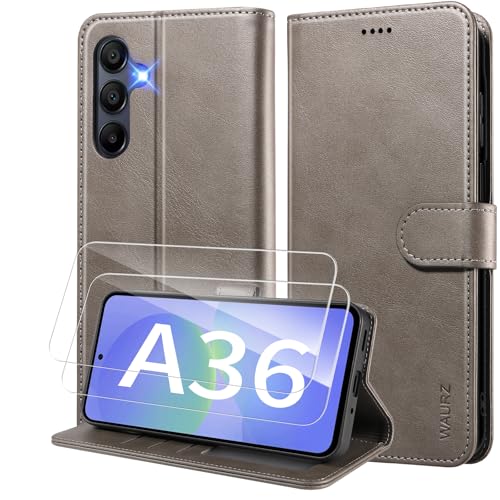 WAURZ Coque pour Samsung Galaxy A36 5G Etui Coque avec 2 Verre Trempé Porte Carte Clapet à Rabat Portefeuille Cuir Case Housse Protection Flip Cover Étui Coque pour Samsung Galaxy A36 5G,Gris