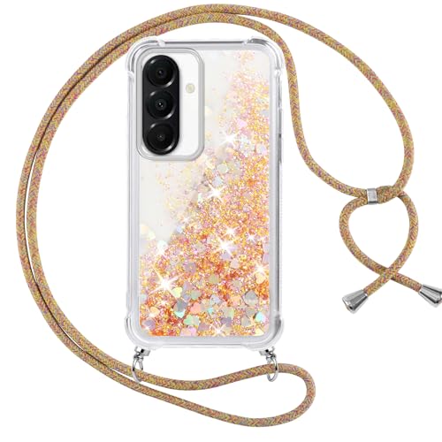 Vauki Coque pour Samsung Galaxy A36 avec Cordon, Paillette Liquide Transparent Crystal Glitter Housse, Protection Antichoc Silicone Souple TPU Bumper Case, Réglable Collier, Or