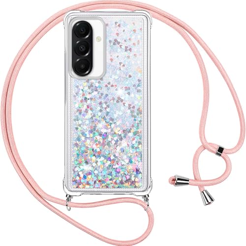 Vauki Coque pour Samsung Galaxy A36 avec Cordon, Paillette Liquide Transparent Crystal Glitter Housse, Protection Antichoc Silicone Souple TPU Bumper Case, Réglable Collier, Argent