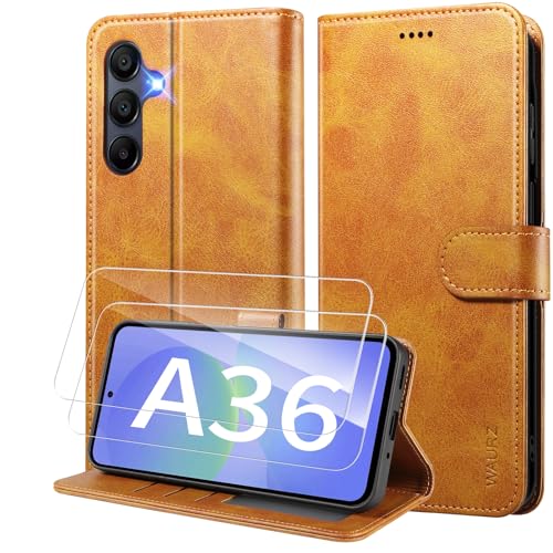 WAURZ Coque pour Samsung Galaxy A36 5G Etui Coque avec 2 Verre Trempé Porte Carte Clapet à Rabat Portefeuille Cuir Case Housse Protection Flip Cover Étui Coque pour Samsung Galaxy A36 5G,Jaune