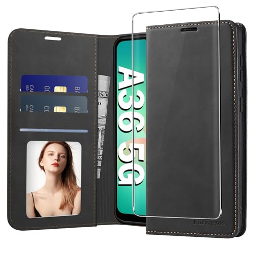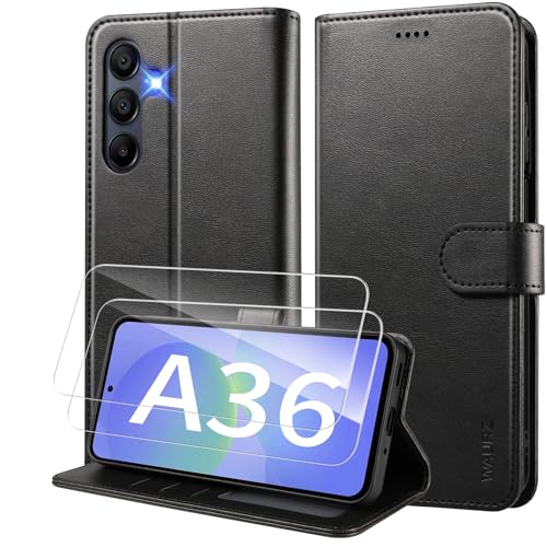 WAURZ Coque pour Samsung Galaxy A36 5G Etui Coque avec 2 Verre Trempé Porte Carte Clapet à Rabat Portefeuille Cuir Case Housse Protection Flip Cover Étui Coque pour Samsung Galaxy A36 5G,Noir
