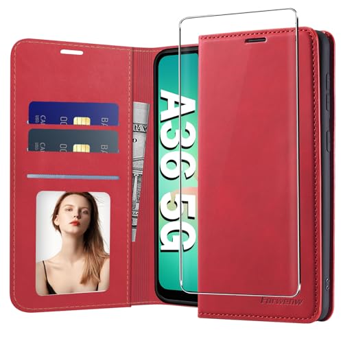 WAURZ Coque pour Samsung Galaxy A36 5G Etui Coque avec 2 Verre Trempé Porte Carte Clapet à Rabat Portefeuille Cuir Case Housse Protection Flip Cover Étui Coque pour Samsung Galaxy A36 5G,Rouge