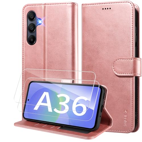 WAURZ Coque pour Samsung Galaxy A36 5G Etui Coque avec 2 Verre Trempé Porte Carte Clapet à Rabat Portefeuille Cuir Case Housse Protection Flip Cover Étui Coque pour Samsung Galaxy A36 5G,Or Rose