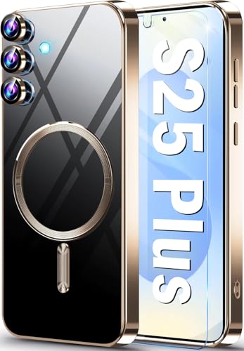 Neivi Coque pour Samsung Galaxy S25 Plus avec Mag-Safe Magnétique, Protection de Caméra, Film de Protection, Transparent TPU Anti-Jaune Souple Bumper Antichoc Coque pour Samsung S25 Plus (Doré)