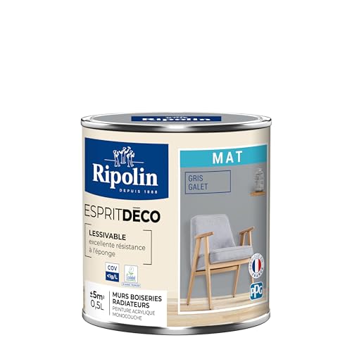 RIPOLIN - Peinture Intérieure Multi-Supports – Murs, Boiseries & Radiateurs – Ultra Couvrante – Lessivable – Application Facile – Ecolabel - Aspect Mat - 0,5L - Gris Galet