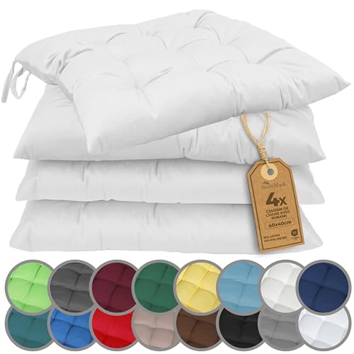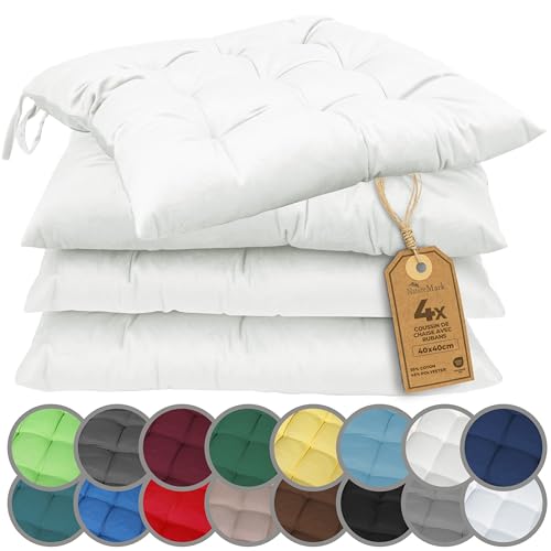 NatureMark Lot de 4 Galettes de Chaises avec Rubans 40x40 cm – Coussin de Chaise Épais pour Intérieur & Jardin – Couleur Blanc