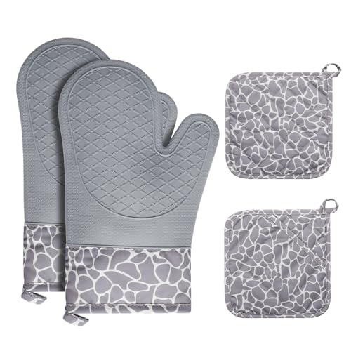 Cozary Lot de 4 Gants de Cuisine, 1 Paire Gants de Cuisine avec 2 Maniques Cuisine, Antidérapants Silicone Gant Cuisine Anti Chaleur pour BBQ, Cuisson au Four, Cheminée - Gris